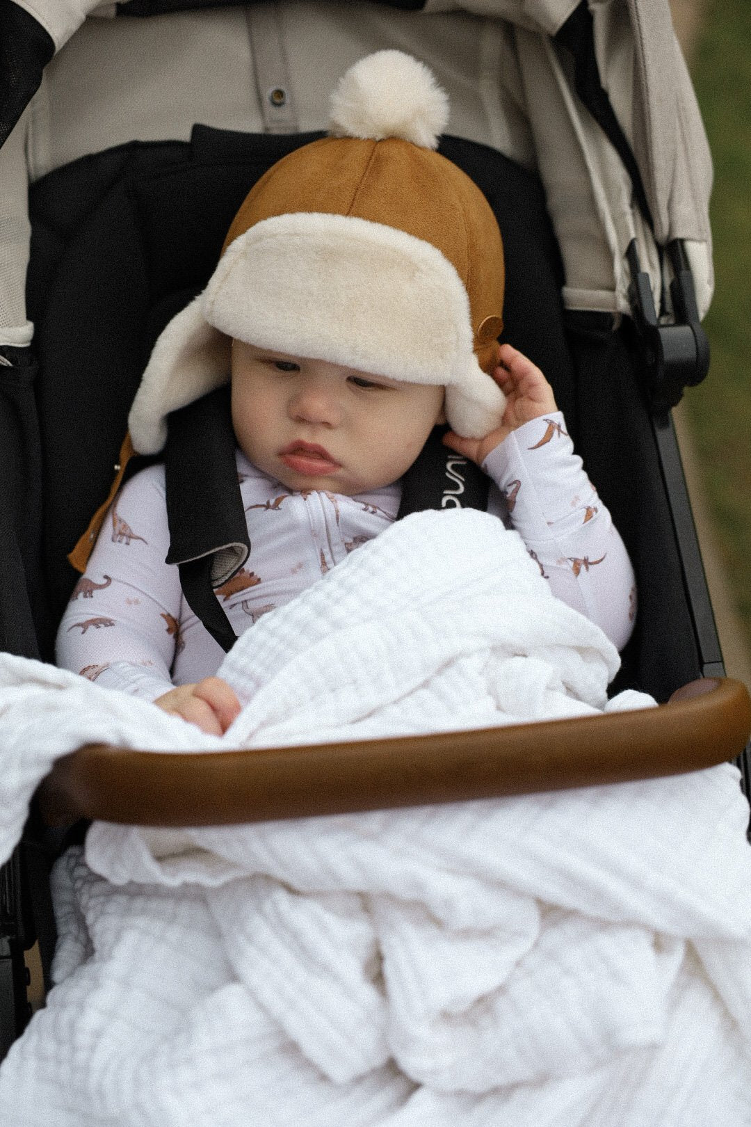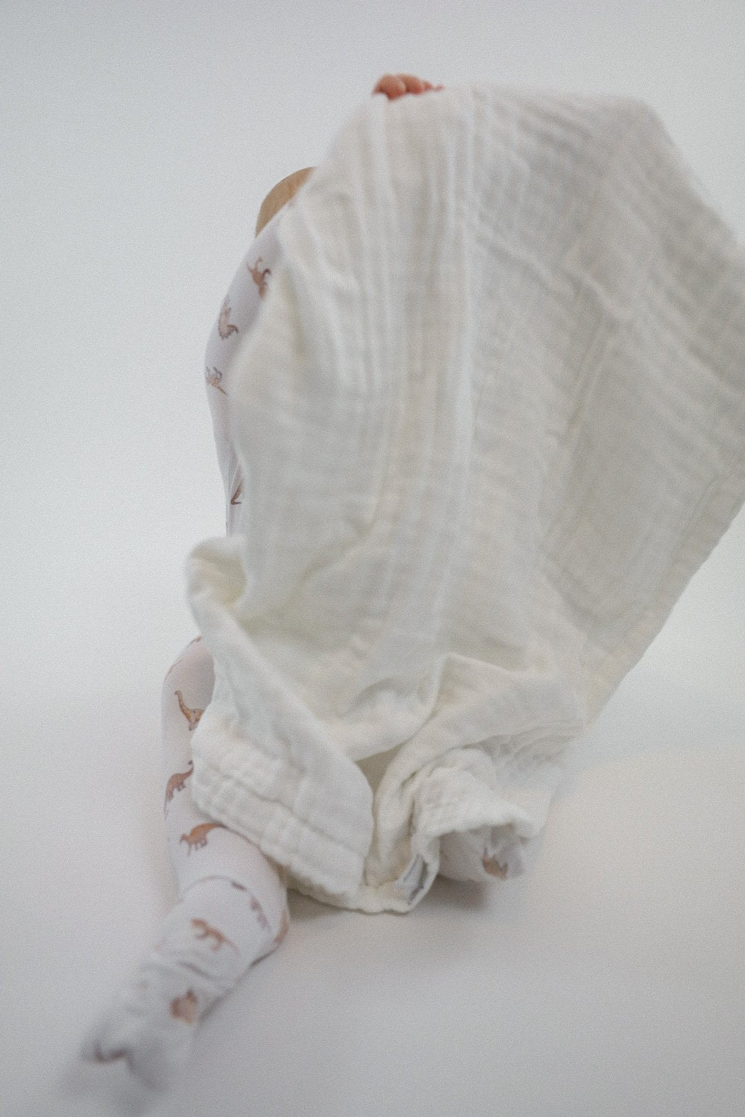 Snuggle up with our 100% Cotton Muslin Quilt in the pure white color of snow. The perfect blanket for newborn photos, a piece that matches every outfit and every nursery. This quilt is 6 layers of powdery, warm muslin that goes from season to season but never goes out of style.