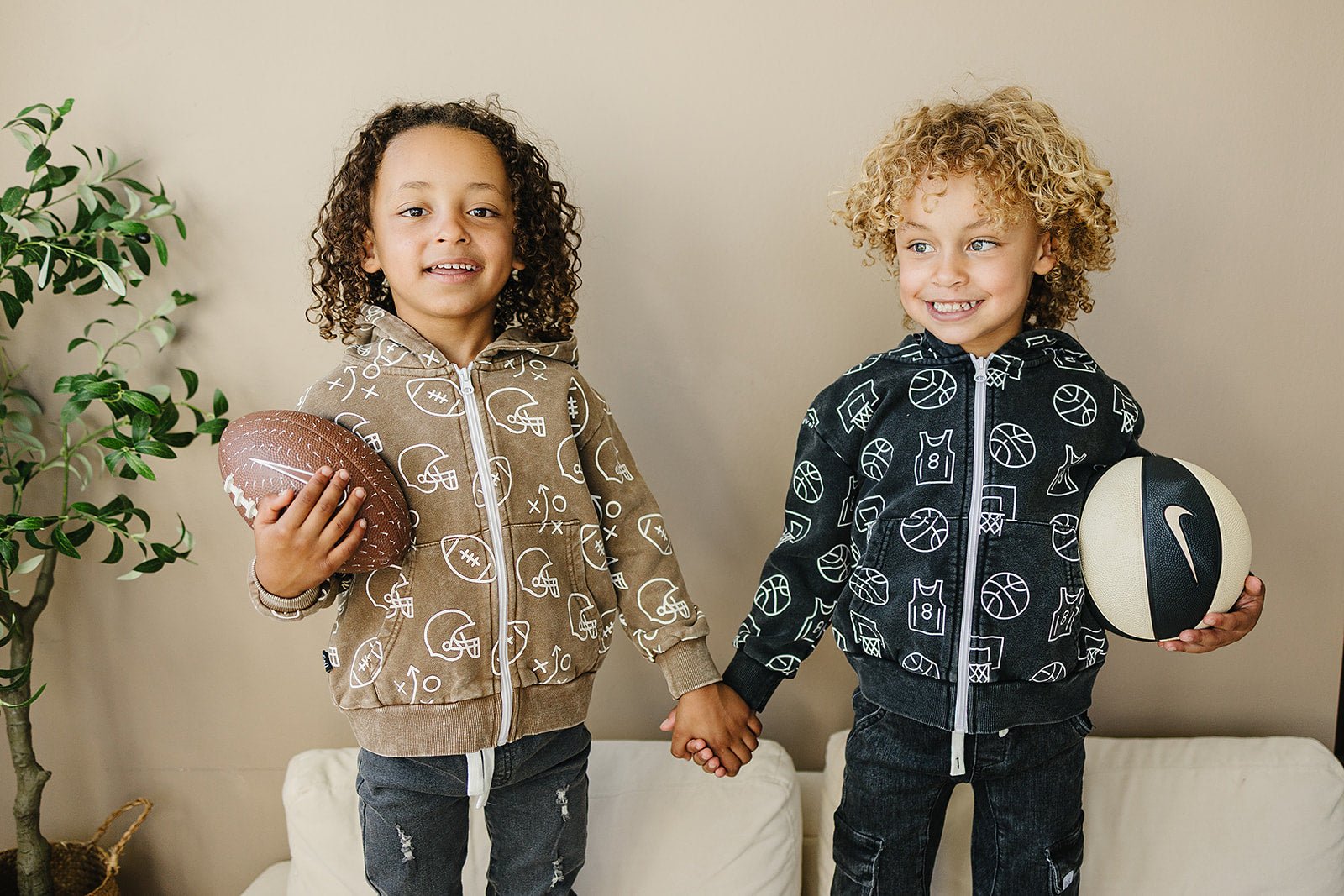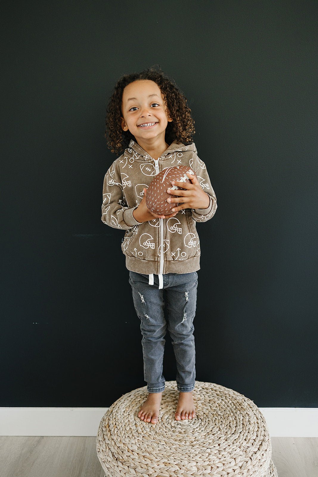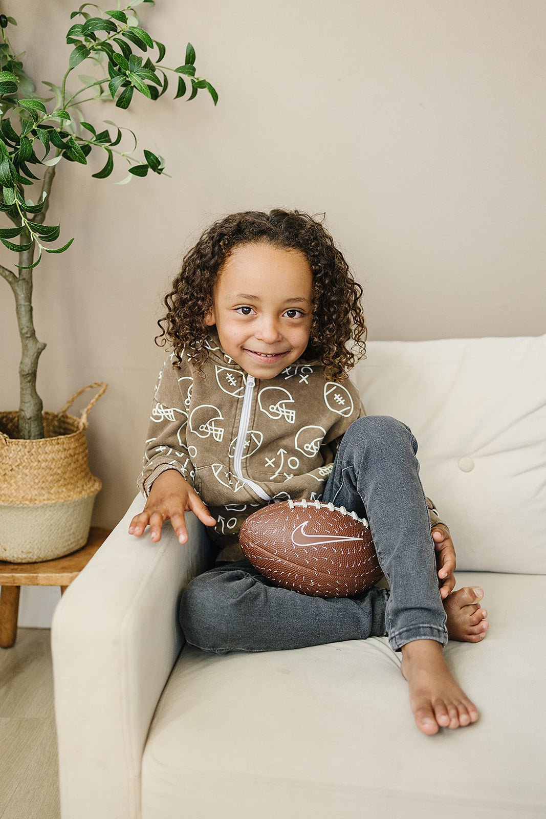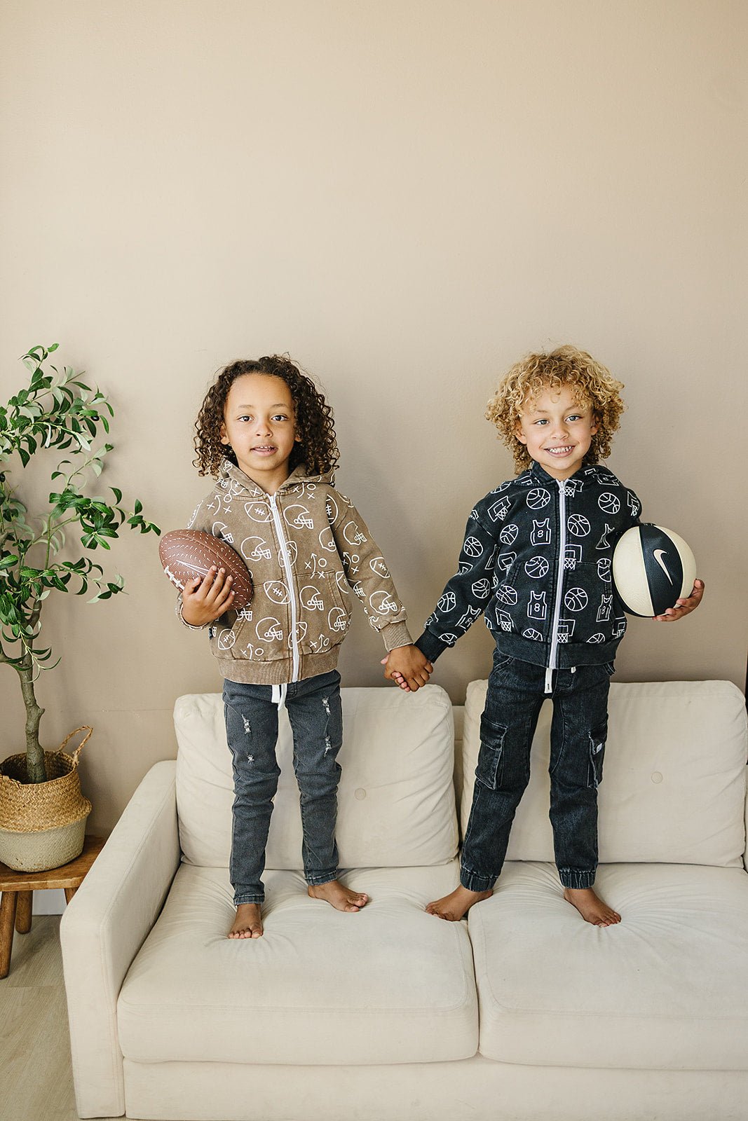 Keep your little one cozy and stylish with the Cohen Zip Up Hoodie, featuring a fun all-over football or basketball print. This playful hoodie is perfect for layering on chilly days, making it a go-to favorite for active kids who love sports and staying comfy.