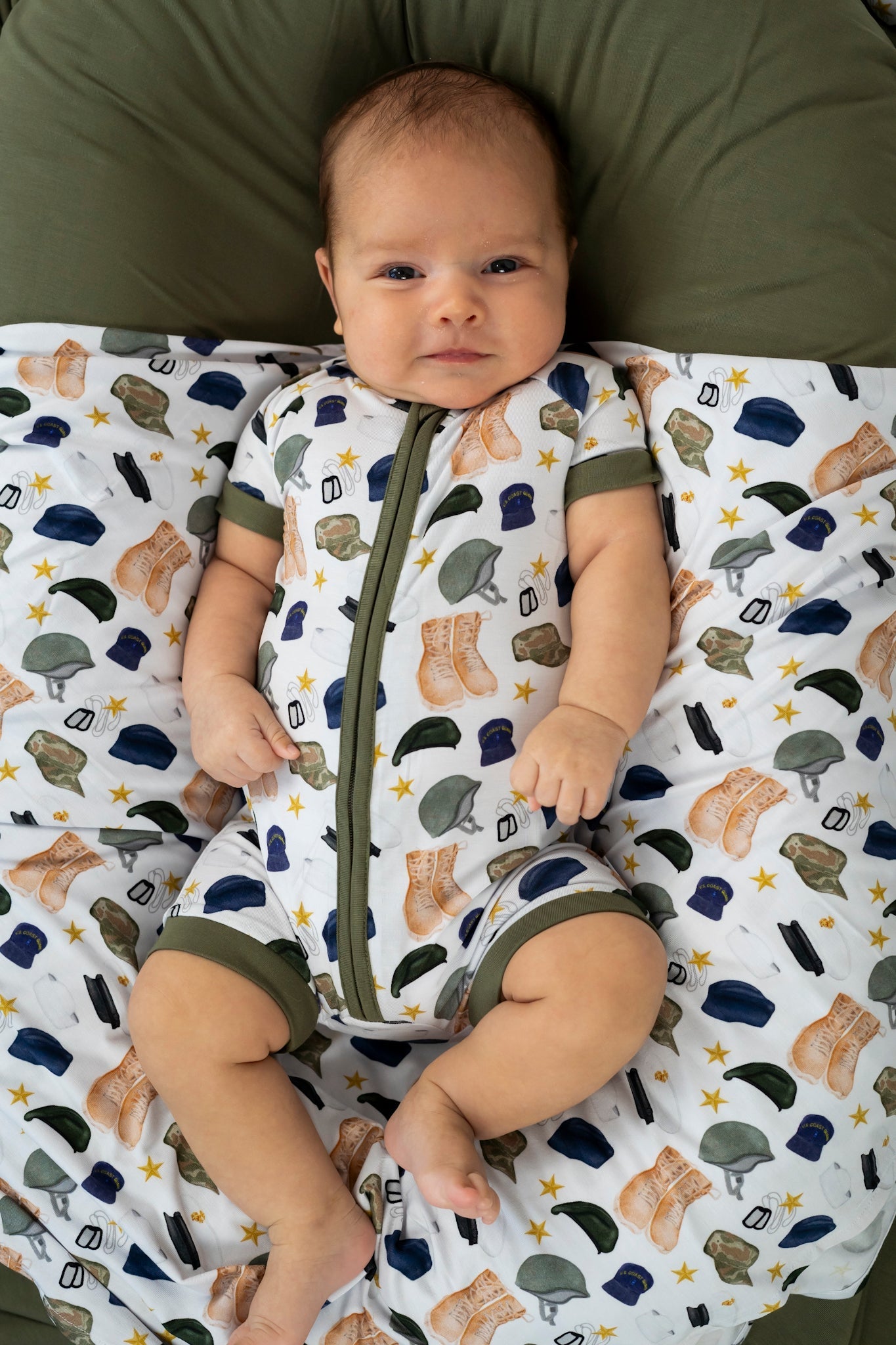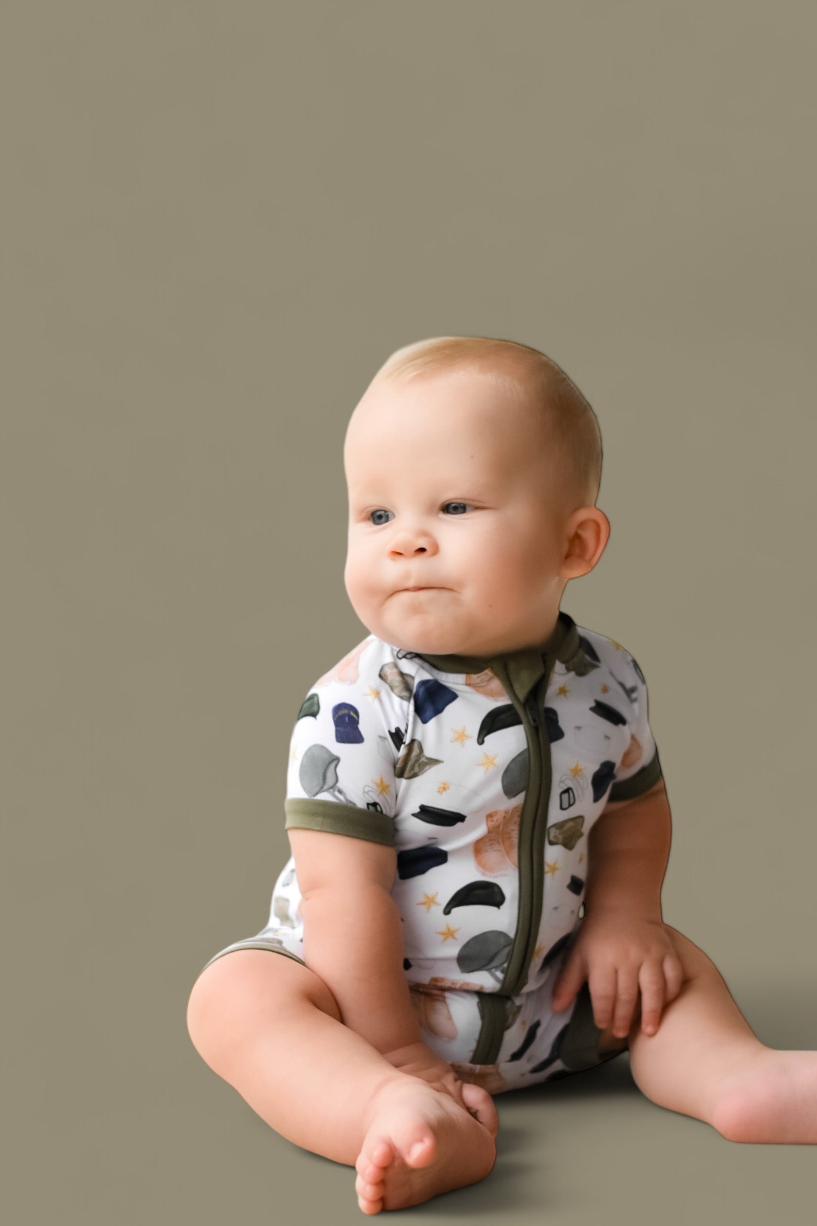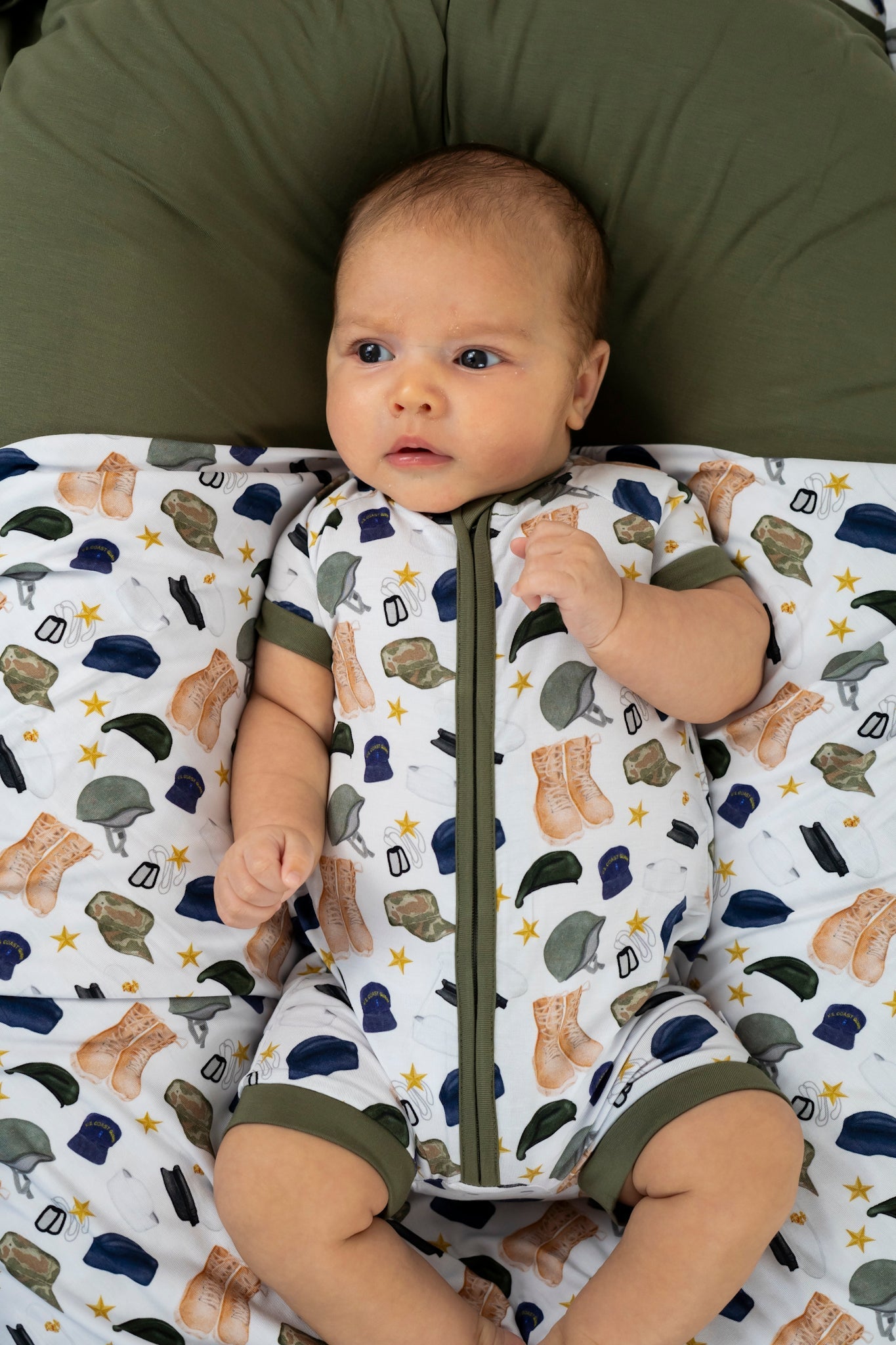 For those warm sleepers, you need to see our new Thank You for Your Service Dream Shortie! This charming short romper is expertly designed to facilitate seamless transitions from playtime to nap time, providing ultimate comfort and convenience. Ideal for those warm summer days, this bamboo shortie is crafted from the softest and most breathable bamboo viscose material, ensuring your baby remains cool and cozy, no matter the activity.