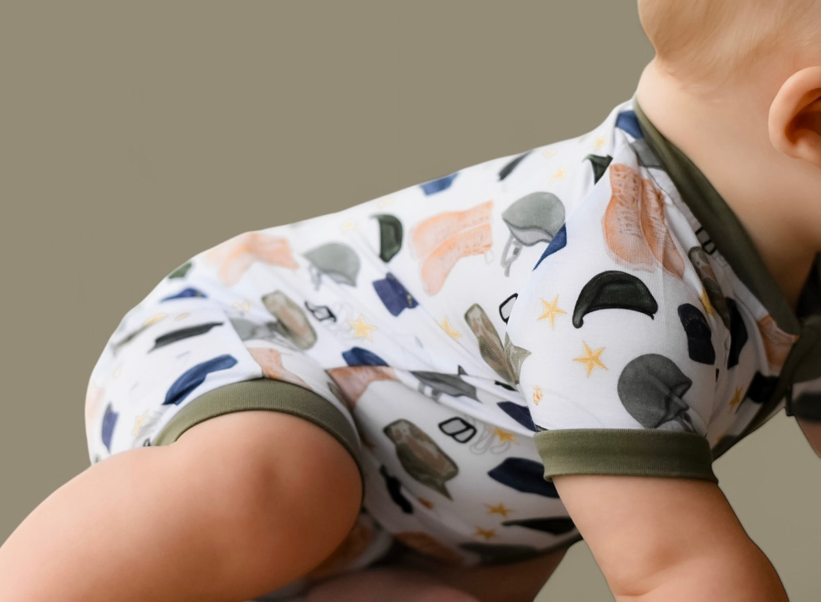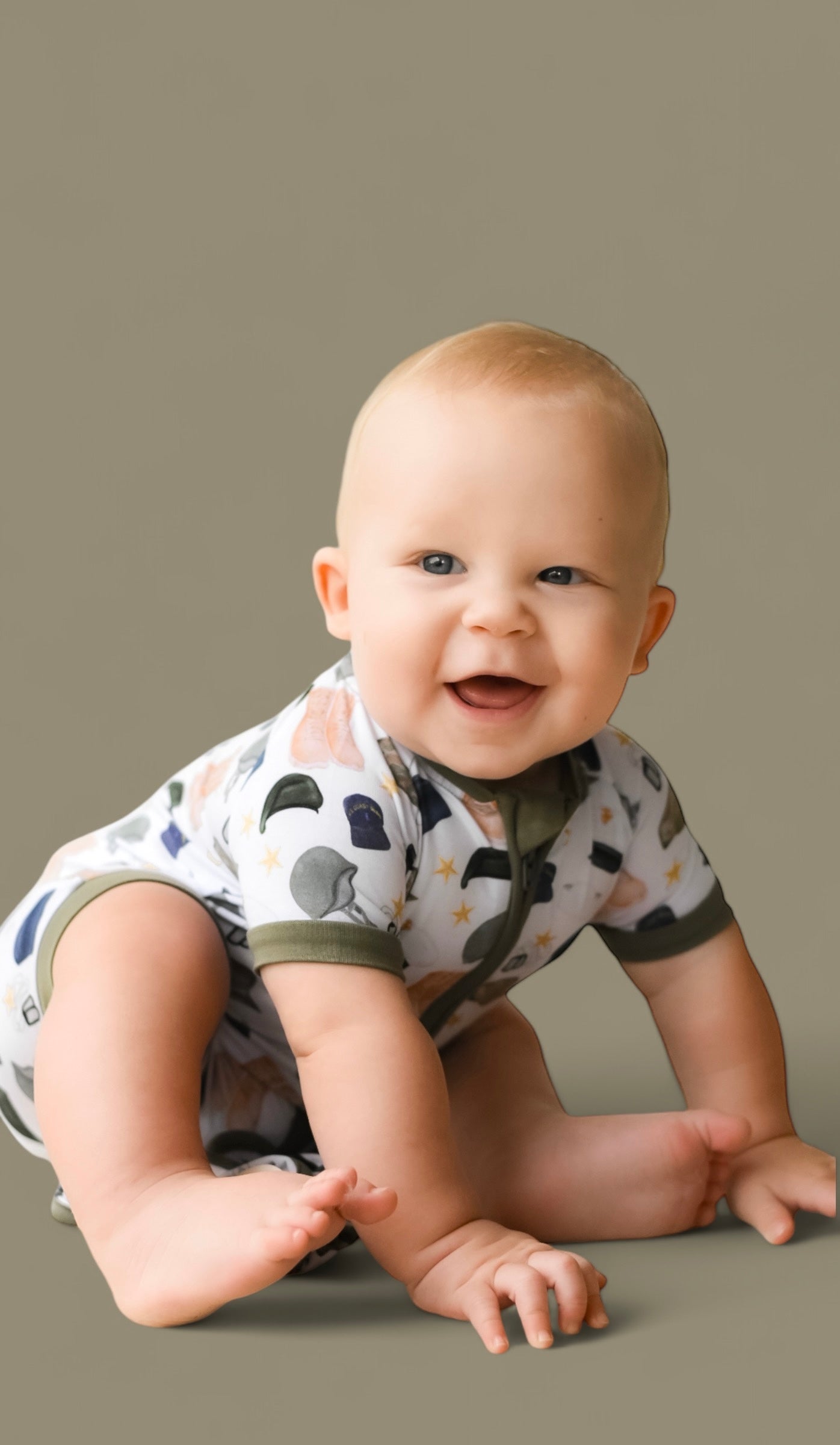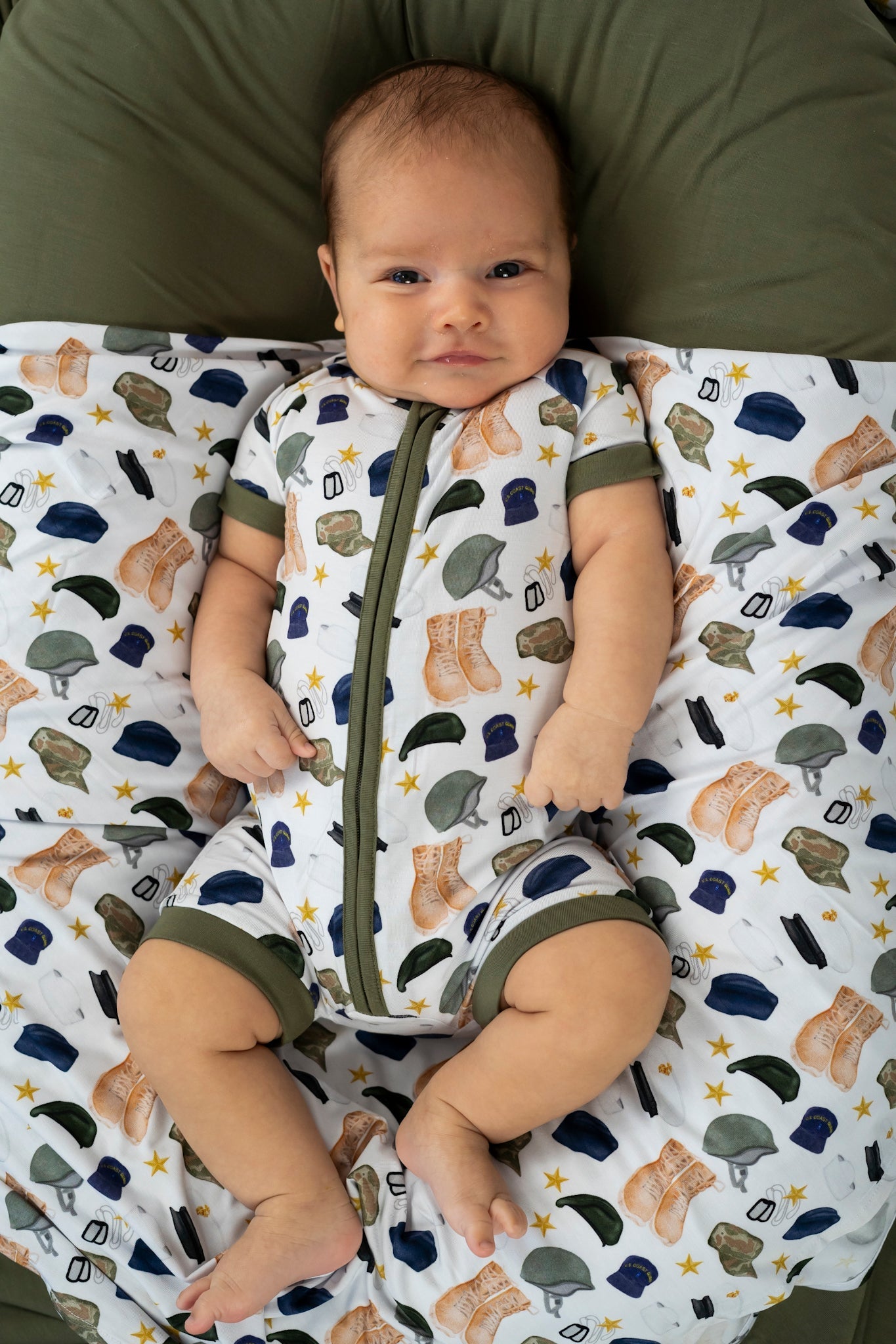 For those warm sleepers, you need to see our new Thank You for Your Service Dream Shortie! This charming short romper is expertly designed to facilitate seamless transitions from playtime to nap time, providing ultimate comfort and convenience. Ideal for those warm summer days, this bamboo shortie is crafted from the softest and most breathable bamboo viscose material, ensuring your baby remains cool and cozy, no matter the activity.