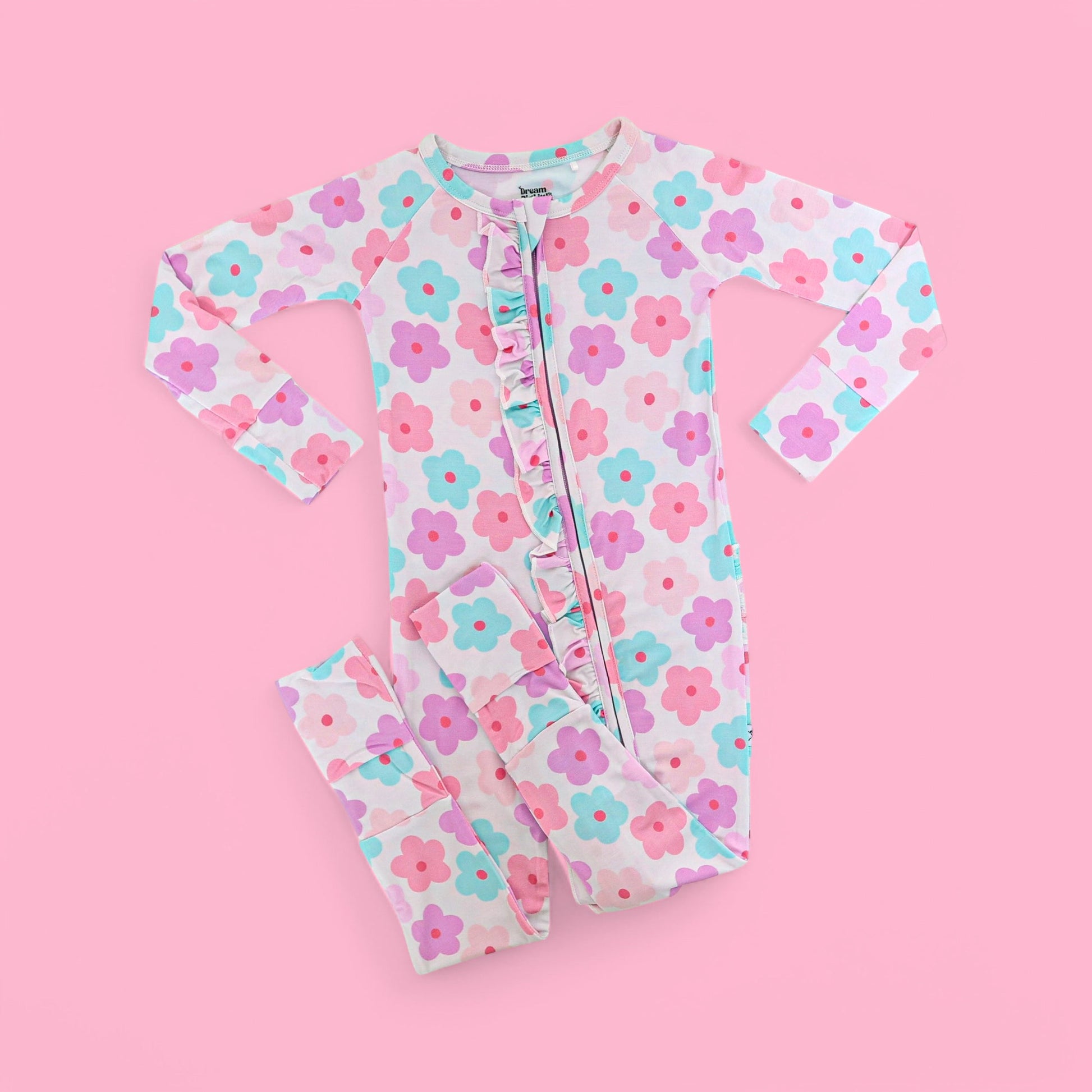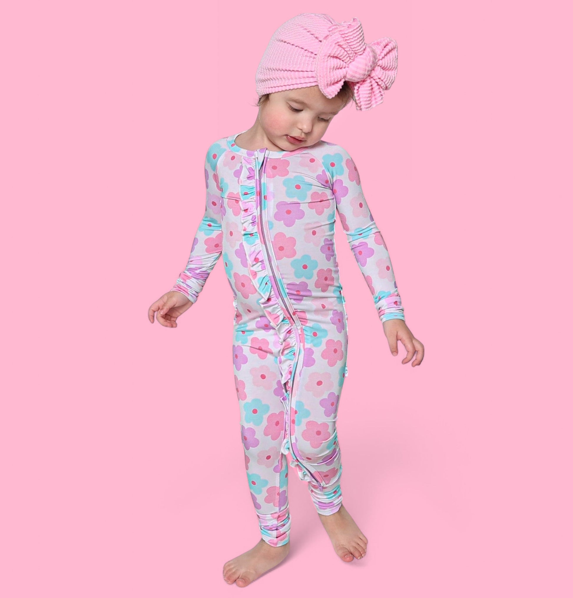 Whether for naptime cuddles or outdoor spring adventures, the Violet Fields Dream Ruffle Romper offers the perfect combination of durability, functionality, and style. Its vibrant floral pattern and gentle fabric make it an irresistible choice for every parent and baby.