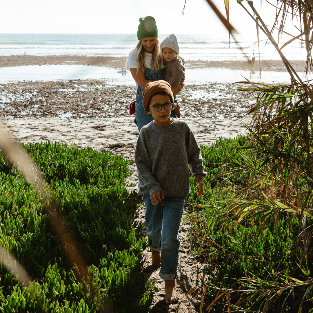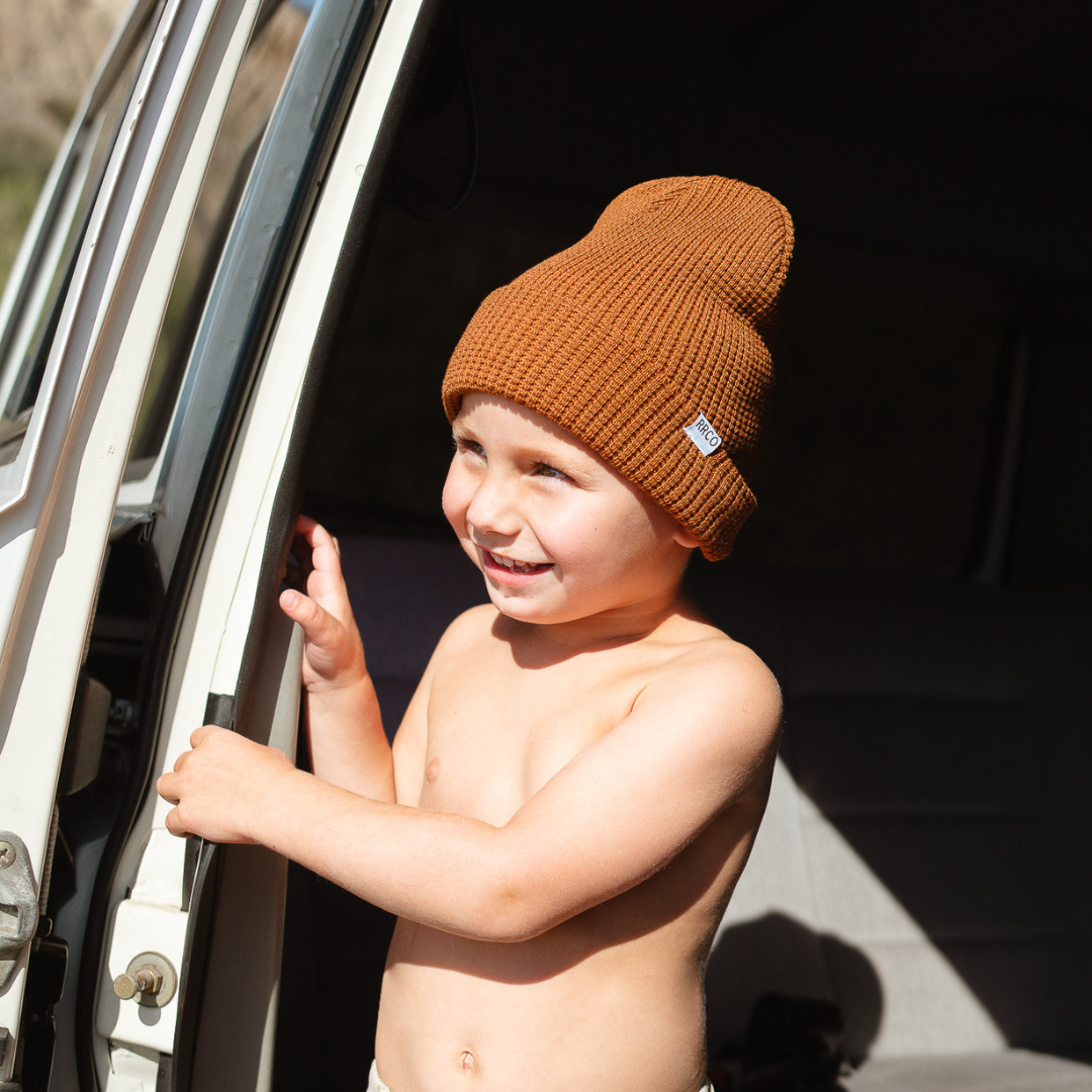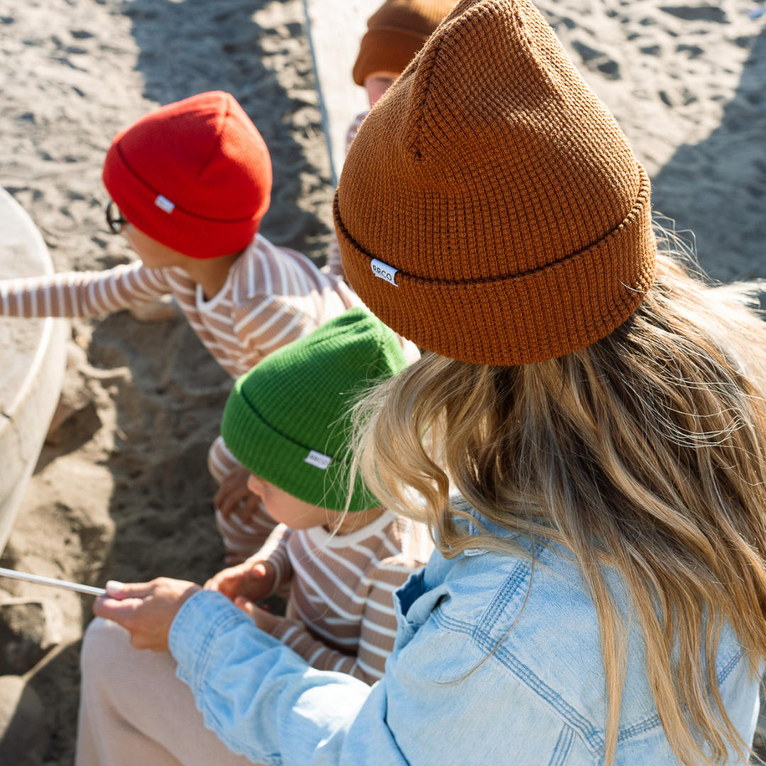 Waffle knit beanie with a fold-over cuff and just the right amount of stretch.